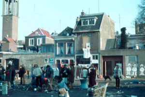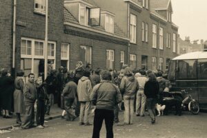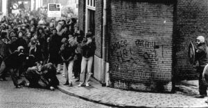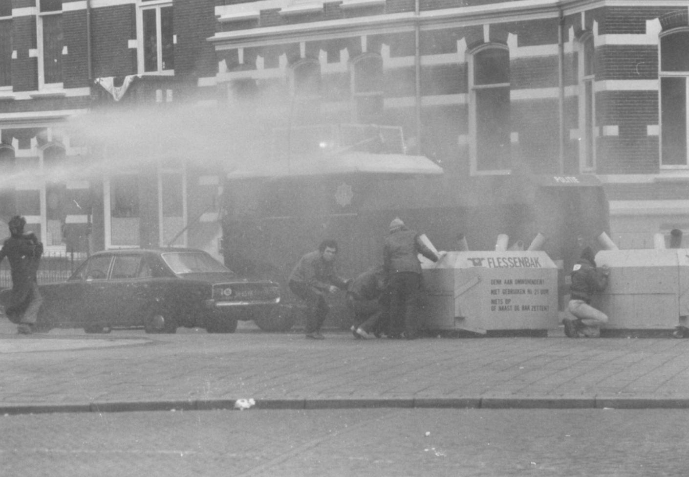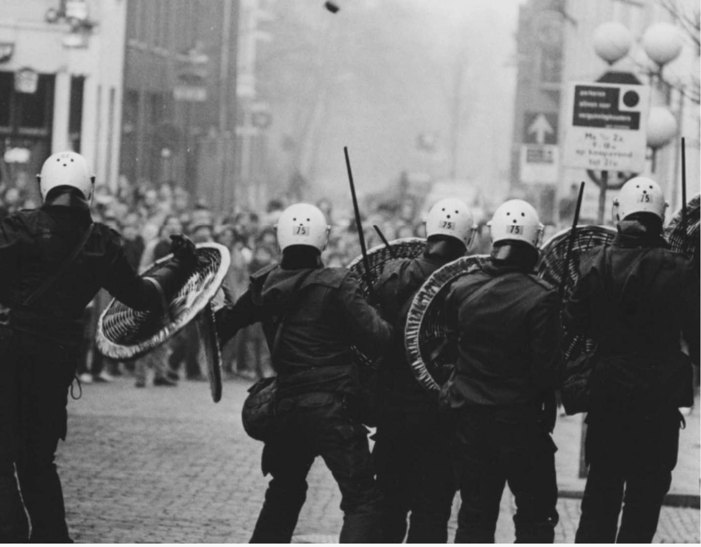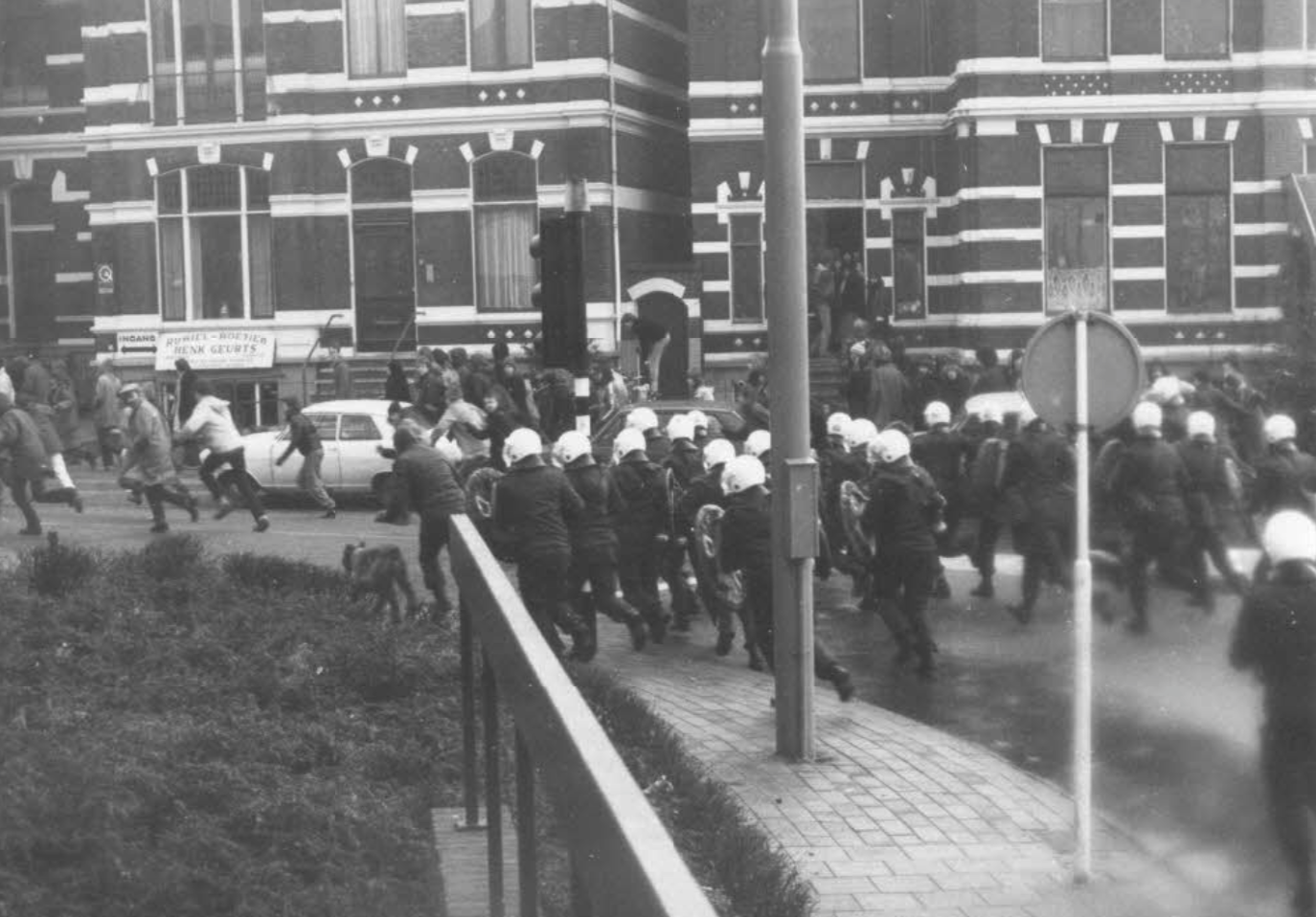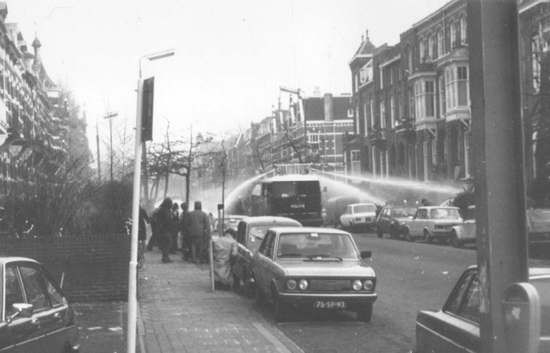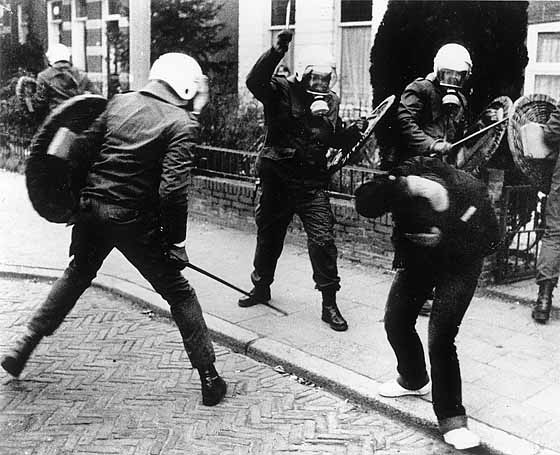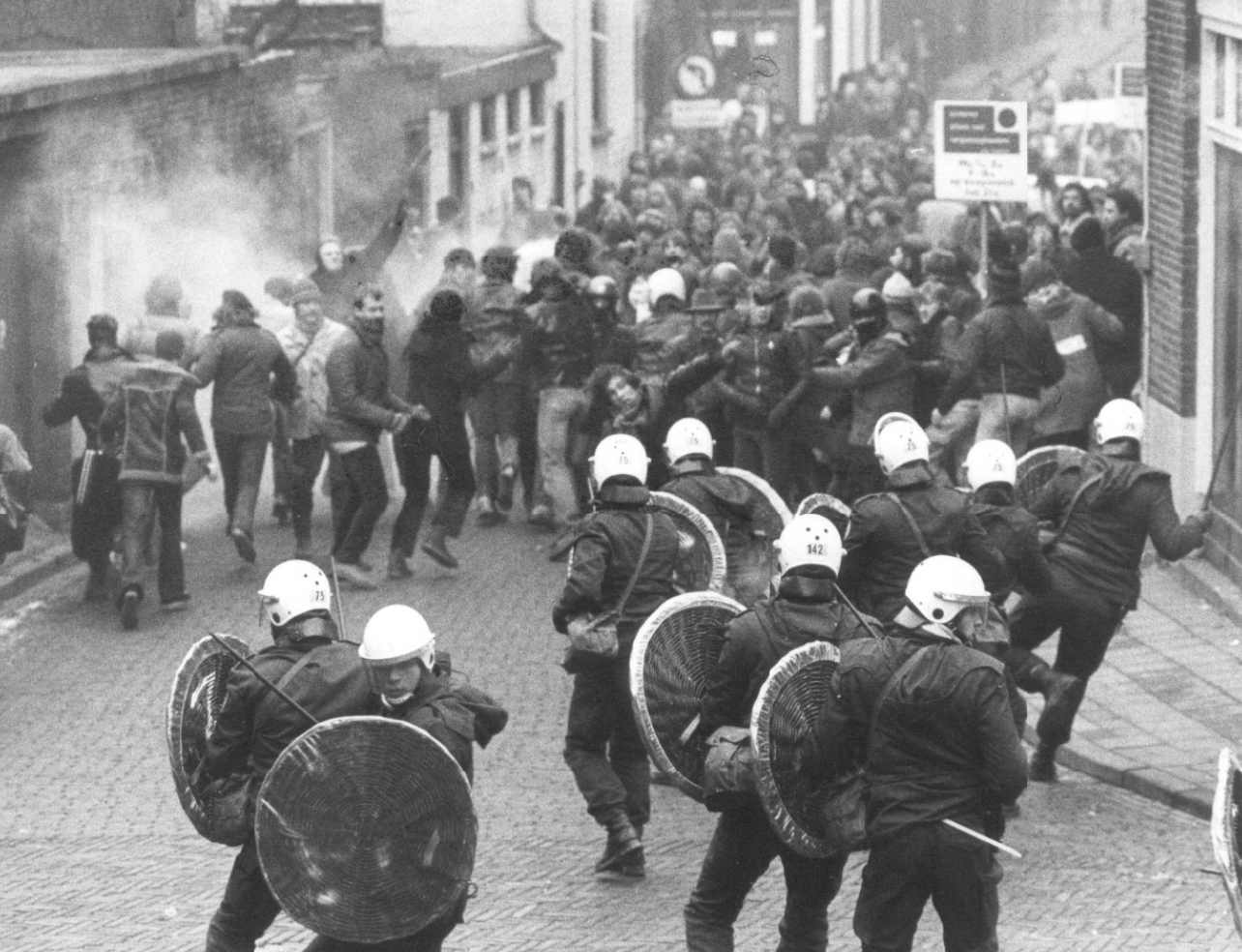 Willemien: Bij het wakker worden ligt mijn vriend kotsend naast me. Verdomme, wat hebben ze aangericht? Ik hield het niet langer uit in bed. Wat zou er allemaal in de stad gebeuren? In mijn hoofd duizelde het en ik voelde me afschuwelijk stijf. Ik zette de radio aan voor het nieuws maar in plaats daarvan kreeg ik een plaat van John Lennon te horen. Het leek of ineens alles in mij omdraaide, er knapte iets in me. Ik begon hard te huilen en kon een tijd geen woord meer uitbrengen. Toen ik weer wat bedaard was voelde ik me bevrijd van een enorme spanning. Opgelucht glimlachte ik wat, maar daarvoor kreeg ik niet zoveel tijd meer. Vijf minuten later stond er ME op onze stoep; ze waren tot in onze straat doorgedrongen nota bene. Ik had nu genoeg kwaadheid en agressie in me om flink tegen ze te schreeuwen. “Oprotten jullie.” Ik ging daarna op zoek naar de demonstratie want ik moest mijn agressie kwijt. Ik had geen bezwaar meer tegen rellen.