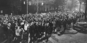 Aad (politie agent): Om half drie in de ochtend vertrok de ME-groep Epe. De korpschef kwam hen uitwuiven. Hoofd koel, voeten warm, werd hen als morele boodschap meegegeven. Voor de middag werd er door de actieleiding een demonstratie uitgeroepen om vier uur, voor een stille tocht door Nijmegen. 20.000 betogers. Ik deed daar ook aan mee, samen met Jan de Goede en Antoinette. Veel mensen, jonge en oudere. Geen helmen, stokken of ander wapentuig. Een meisje lag gewond op straat, een ambulance van de plaatselijke GGD stopte naast haar. Een krankzinnige automobilist had haar aangereden, omdat hij zijn weg versperd vond door de optocht. Zo wordt nu eenmaal opgetreden tegen krakers en hun aanhangers. Een ander meisje speelde op haar accordeon. Er werden stencils met tekst uitgedeeld. Er zou gezongen worden op de wijs van: ‘het is de schuld van ’t kapitaal’.