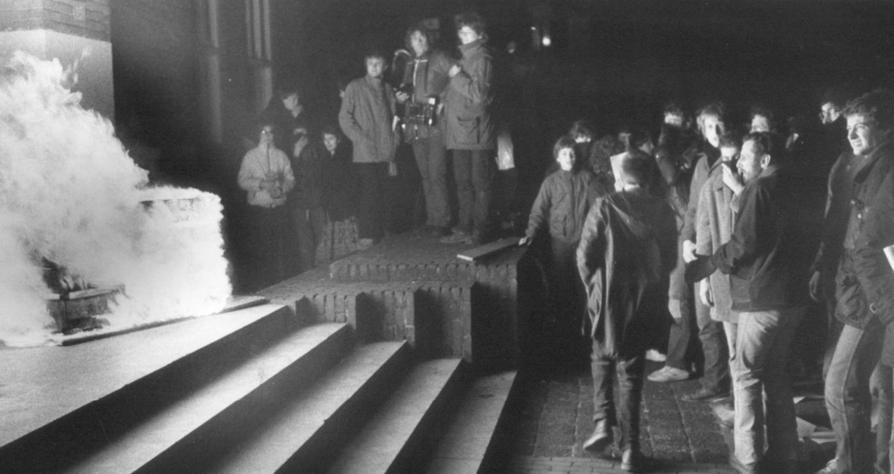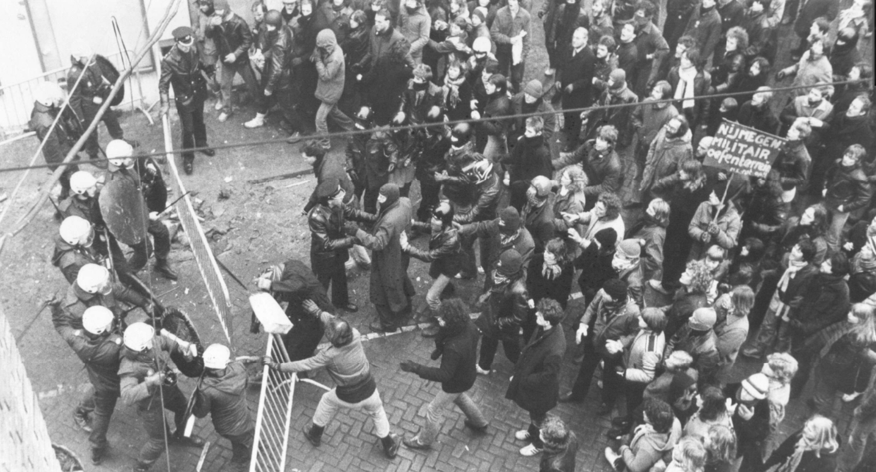Donderdag 26 februari: Nog nooit zijn er zoveel krakers en sympathisanten op de been geweest als deze avond in Nijmegen. Voor eerst na de ontruiming weer door de Piersonstraat. Daar staat men op een kaalgeslagen vlakte. Onder een indrukwekkende stilte trekt men over het pleintje. Onder het spelen van treurmuziek worden kransen gelegd. Daarna gaat men richting de Aula aan de Wilhelminasingel, waar burgemeester Hermsen het politieoptreden zit goed te praten in de gemeenteraad. Terwijl niemand de Aula meer in of uit mag, steken de massa’s mensen buiten niet onder stoelen of banken wat zij ervan vinden. De eis, dat Hermsen en de zijnen moeten oprotten, wordt kracht bijgezet door het ingooien van ruiten en het gebeuk op de deuren. Ongeveer een uur lang blijft de enorme menigte voor de Aula staan, daarna gaan de meesten weg, naar huis of naar de Vereeniging, waar de raadsvergadering via een groot tv-scherm te volgen is.