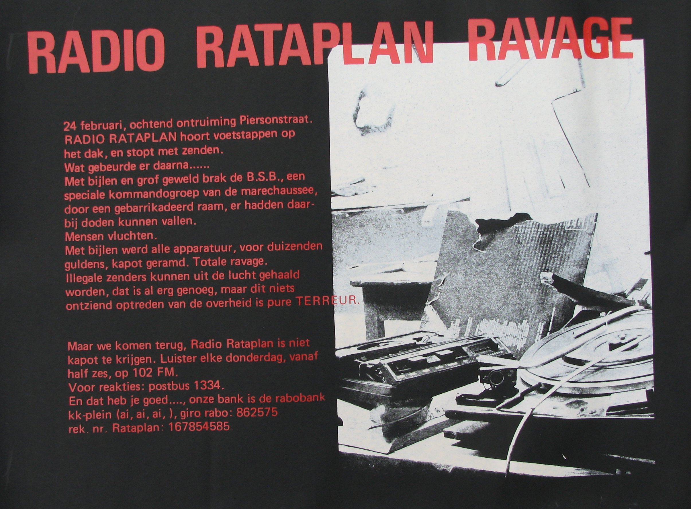 “Hier is radio Rataplan, hier is radio Rataplan, Rataplan zender 2. Zender nr 4 is net ongeveer een kwartier geleden de lucht uitgehaald door de politie. Zender 4 zat op de Pontanusstraat. Zender 4 is uit de lucht, wij zenden nu alleen nog met 2 en 1 binnen de barricades op de Piersonstraat. Wij roepen iedereen op om in actie te komen. Wij roepen iedereen op om in actie te komen. De autoriteiten hebben het gewild. We hebben tot het laatst toe alles open gehouden om te onderhandelen.”
