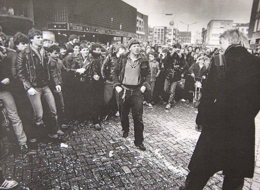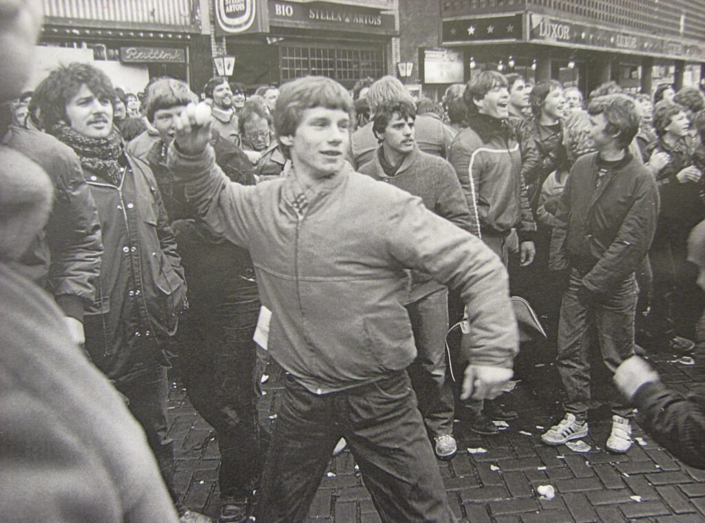 Rond half vier vliegen er weer stenen door de lucht. Iemand raakt gewond en wordt snel het steegje achter De Plak ingetrokken. Een van de sympathisanten gaat op z’n dooie eentje met de stenengooiers praten. Hij straalt zoveel overwicht uit dat ze zich inderdaad even rustig houden. Dan komen er ‘verse’ aanrennen en begint het gooien opnieuw. De brandspuit wordt erop gezet, dat helpt even. Er wordt weer een blokkade gevormd die vóór de barricade gaat staan.Er komen nog meer ruziezoekers, ook veel meisjes keren zich tegen ons. Er wordt tegen de voorste rijen geduwd, met helmen geslagen. Dan hebben ‘ze’! iets nieuws ontdekt, eieren gooien. Tientallen vliegen er door de lucht, af en toe komt er een rotje mee of een steen. De sfeer is uitermate gespannen.
